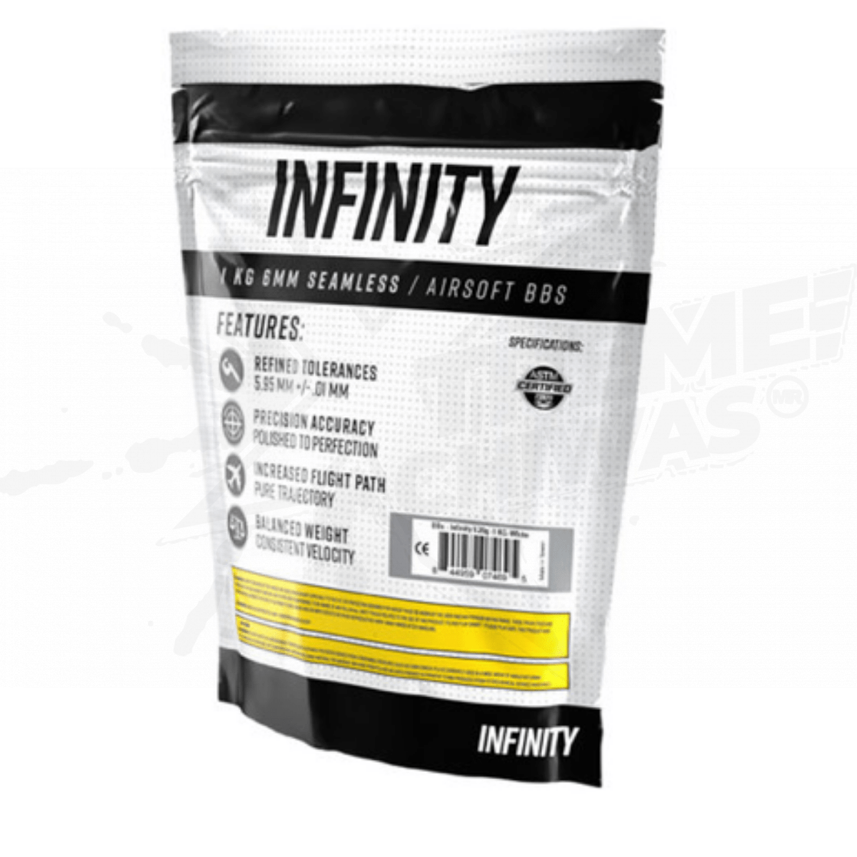 Los BB de airsoft Infinity 0.20g son BB de plástico de precisión de 6 mm de Taiwán que son BB altamente pulidos y sin costuras para rifles de airsoft de 6 mm y pistolas de airsoft. Su precisión de calidad de rodamiento de bolas le da a la trayectoria de vuelo una mayor precisión y consistencia. Los Infinity airsoft BB están empaquetados en bolsas resellables de 1 kilogramo. Recomendamos nuestro cargador de velocidad Valken M4 Magazine Style BB para usar con Infinity BB cuando se cargan cargadores de tamaño medio.