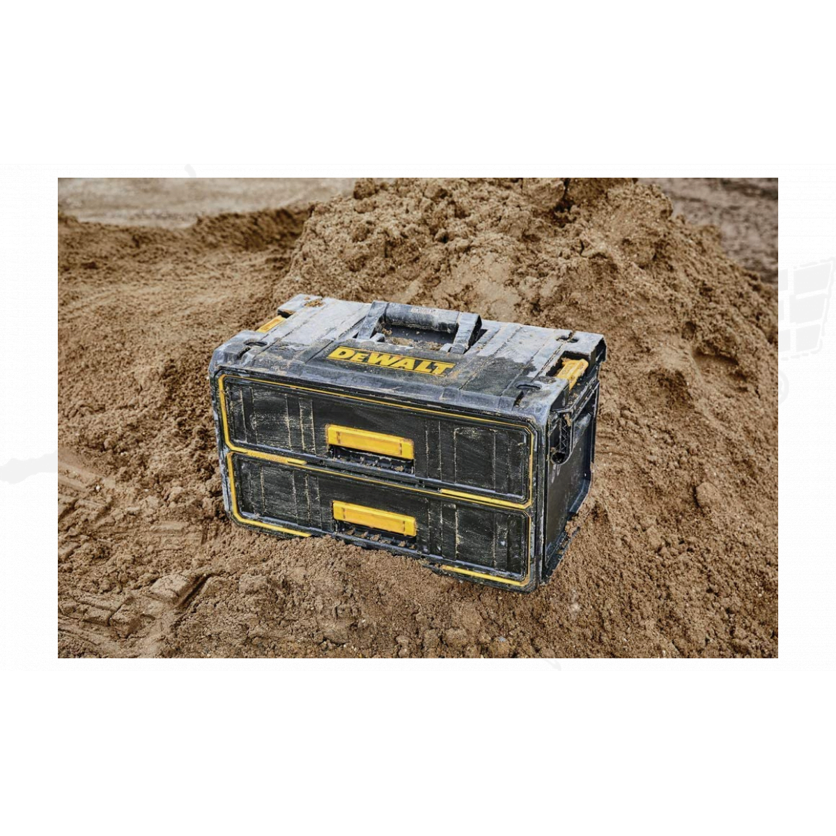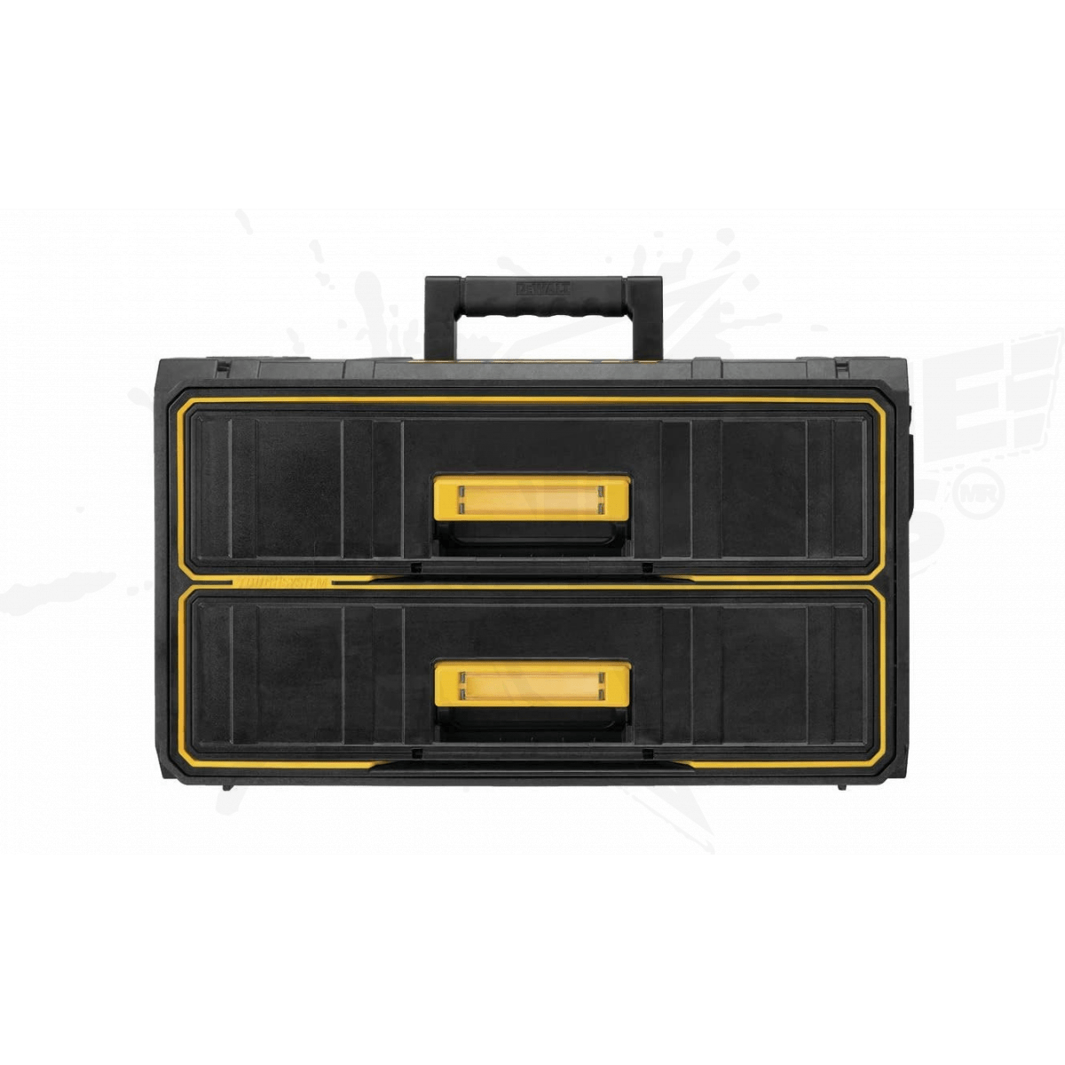 Dos cajones profundos para herramientas manuales Guías de metal con cojinetes de bolas para un acceso conveniente a los cajones Las manijas laterales permiten montar las unidades en los soportes ToughSystem® Los pestillos apilables permiten la conexión a otros módulos ToughSystem®