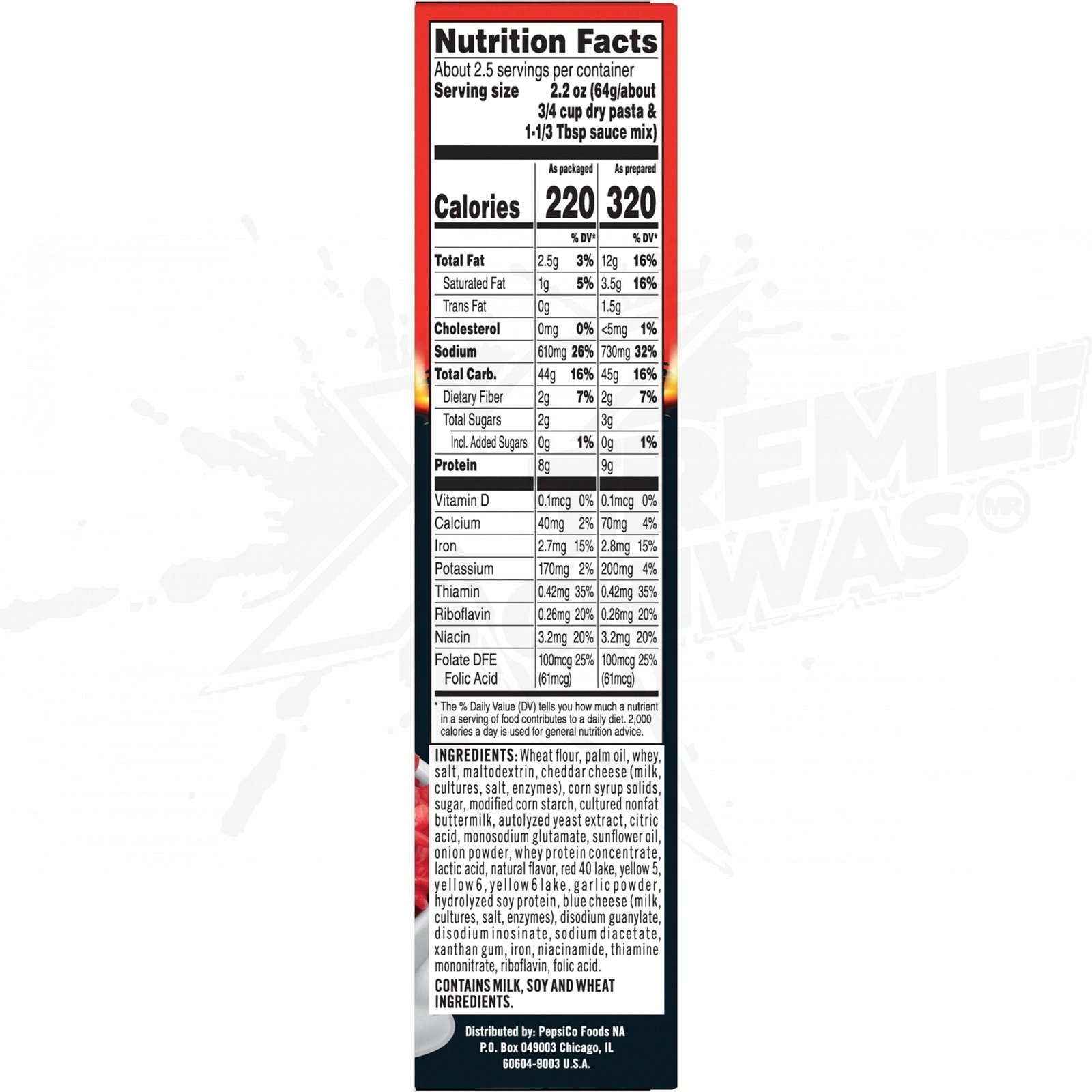 Ingredientes: Harina de Trigo, Suero de Suero, Aceite de Palma, Sal, Maltodextrina, Queso Cheddar (Leche, Cultivos, Sal, Enzimas), Sólidos de Jarabe de Maíz, Azúcar, Almidón de Maíz Modificado, Extracto de Levadura Autolizada, Ácido Cítrico, Glutamato Monosódico, Aceite de Girasol, Cebolla Polvo, Concentrado de proteína de suero, Leche descremada cultivada, Ácido láctico, Suero de mantequilla, Sabor natural, Laca roja 40, Laca amarilla 5, Amarilla 6, Laca amarilla 6, Ajo en polvo, Proteína de soja hidrolizada, Queso azul (Leche, cultivos, sal, enzimas) , Guanilato de disodio, inosinato de disodio, diacetato de sodio, goma guar, goma xantana, hierro, niacinamida, mononitrato de tiamina, riboflavina, ácido fólico