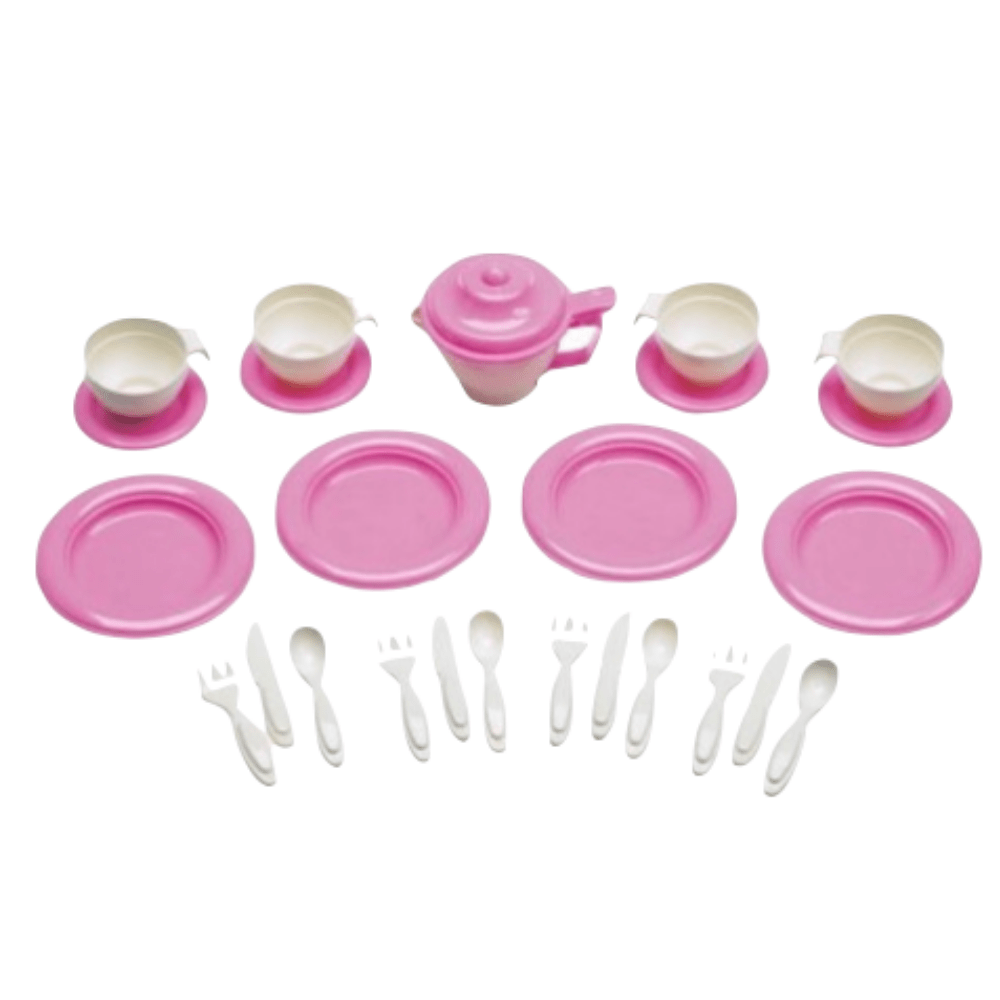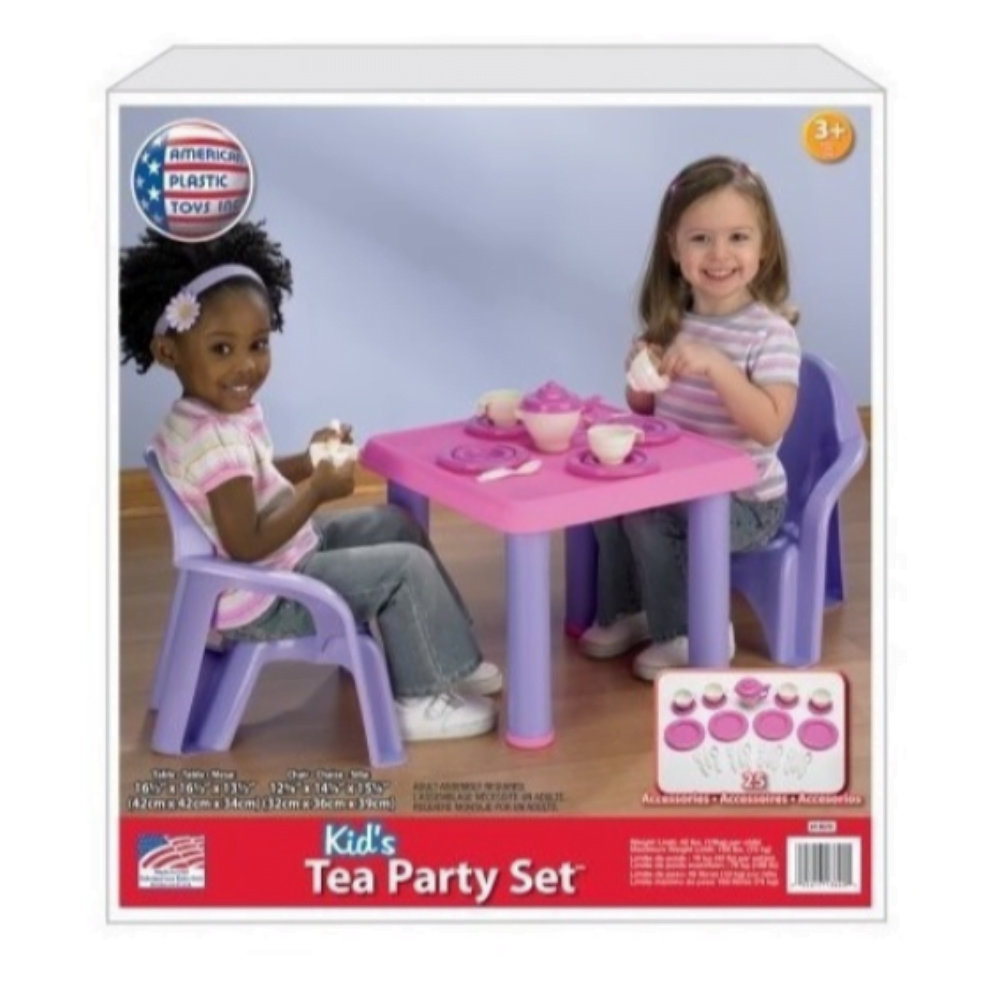 La mesa Toy Tea Set es de color púrpura brillante con toques rosados y la vajilla y los cubiertos son de color rosa y blanco. Este conjunto de fiesta de té versátil y fácil de cuidar se puede utilizar como una tabla de actividades y puede ser utilizado por niños que pesan hasta 19 kg.