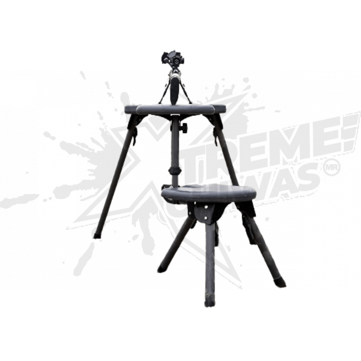 FACILIDAD DE USO: La mesa se despliega para su instalación y el asiento ambidiestro pivota alrededor de la pata trasera de la mesa para una máxima comodidad de tiro