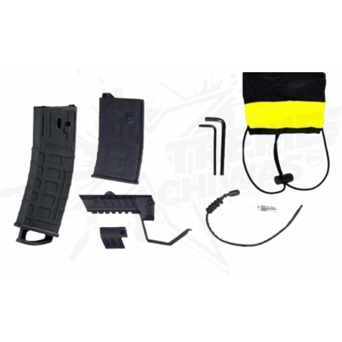 -Incluye cubierta frontal táctica, miras abatibles hacia arriba y traseras, material plegable de 6 posiciones, cargador ficticio, 2 cargadores de paintball y piezas de conversión de cargador a cargador.