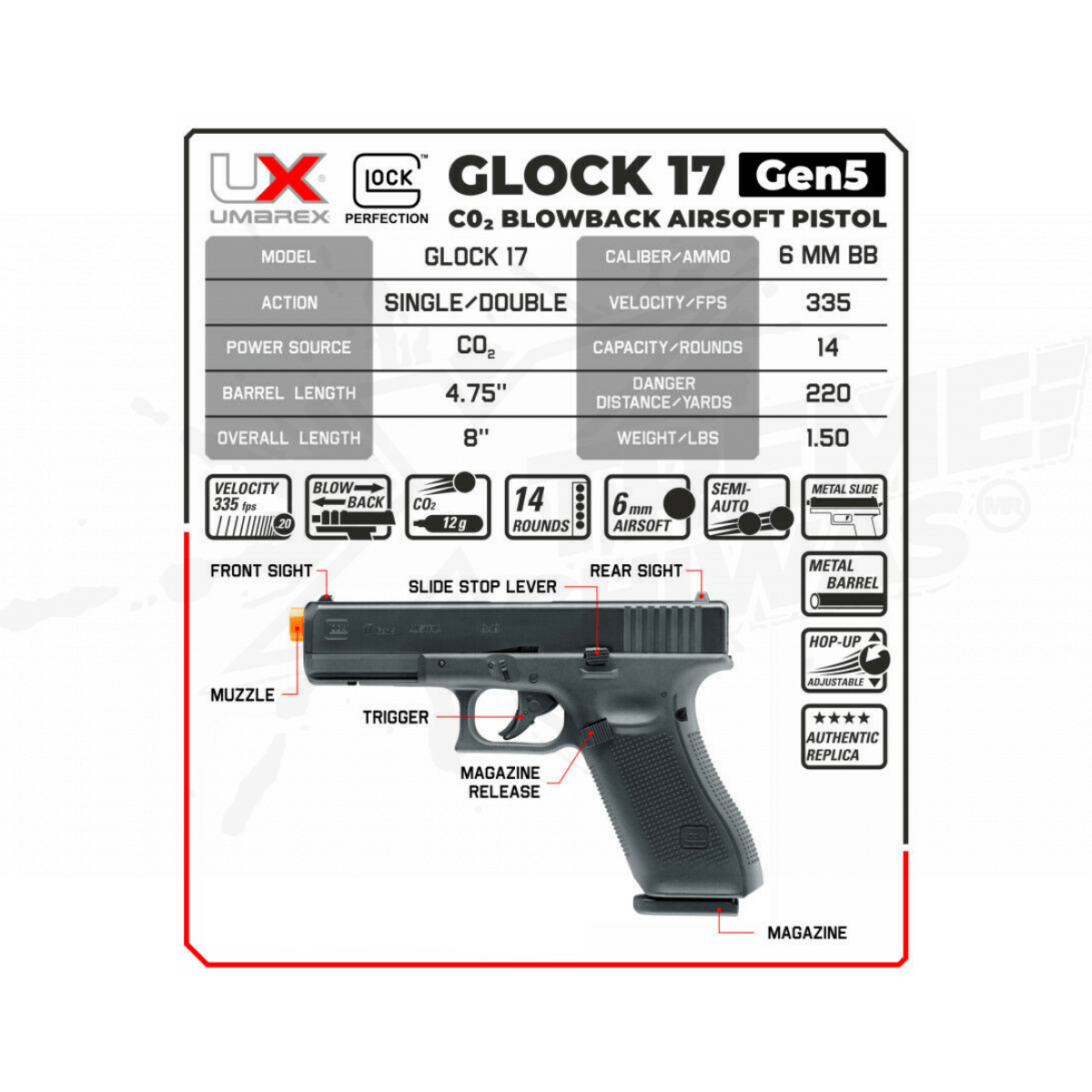 Esta pistola de airsoft GLOCK 17 Gen5 reproduce fielmente las mismas características externas que el arma de fuego. Esta pistola de airsoft de 6mm funciona con green gas y dispara con un ciclo nítido y rápido. El modelo G17 Gen5 GBB con licencia oficial de UMAREX funciona con muchos accesorios del mercado de accesorios diseñados para pistolas GLOCK tales como luces de pistola, fundas, etc. ¡Esta GLOCK Gen 5 cuenta con el último sistema de válvula de potencia que proporciona un increíble impulso de retroceso, fácil de ajustar hop-up, y el uso eficiente del green gas!