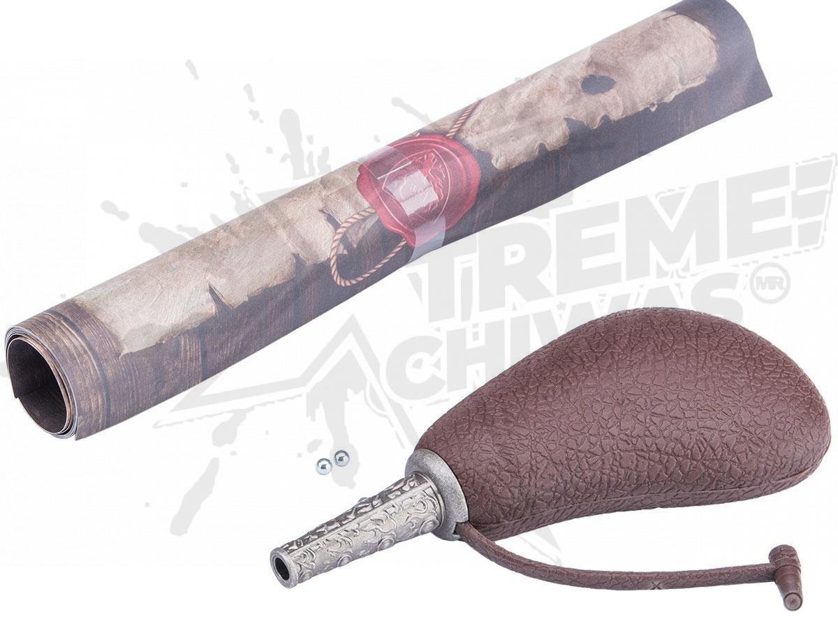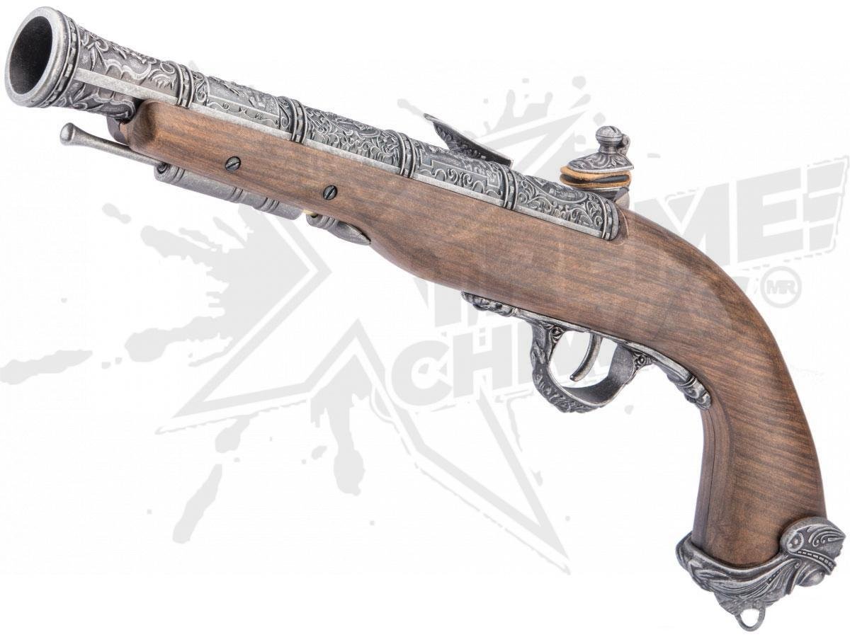 Una base de imitación de madera y metales chapados en latón de imitación le dan a esta pieza de réplica de época una sensación fuerte y un nivel de autenticidad que hacen que esta pistola sea verdaderamente única. La hermosa filigrana adornada realmente llama la atención cuando te pones tu pistola de pedernal para poner fin a la disputa entre tú y el sinvergüenza que se atreve a insultar tu buena naturaleza. Equipado con características realistas similares a una pistola de pedernal real, sigue los pasos de amartillar el martillo y bloquear la bandeja del flash antes de disparar el arma. Este enfoque de pedernal y acero para amartillar y disparar cada tiro realmente distingue a esta réplica con ese toque extra de autenticidad. Con la pistola se incluye un frasco de pólvora de piel sintética para sostener y cargar sus BB, así como un pergamino enrollado estilo pergamino para el manual de instrucciones.