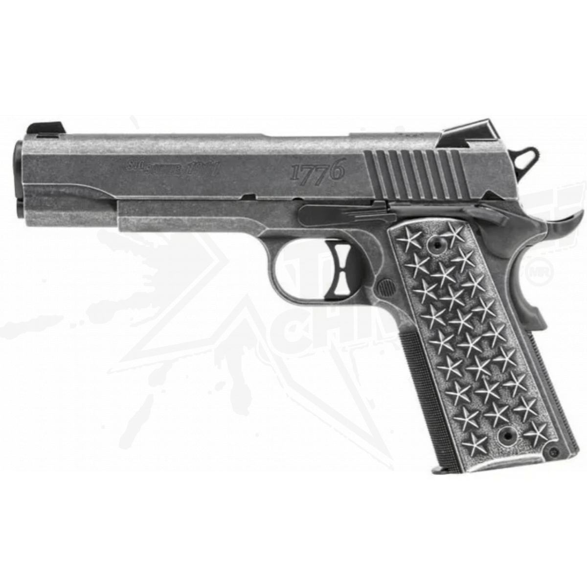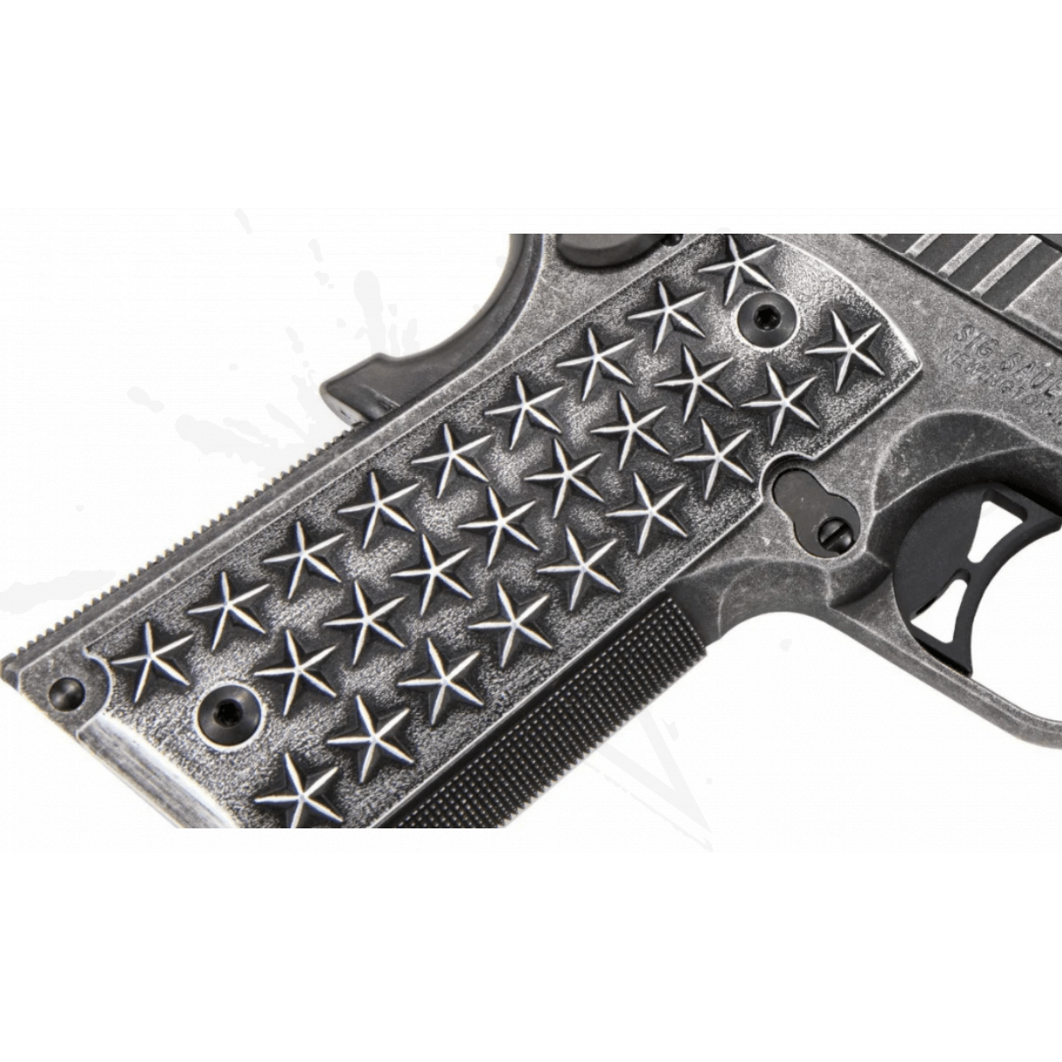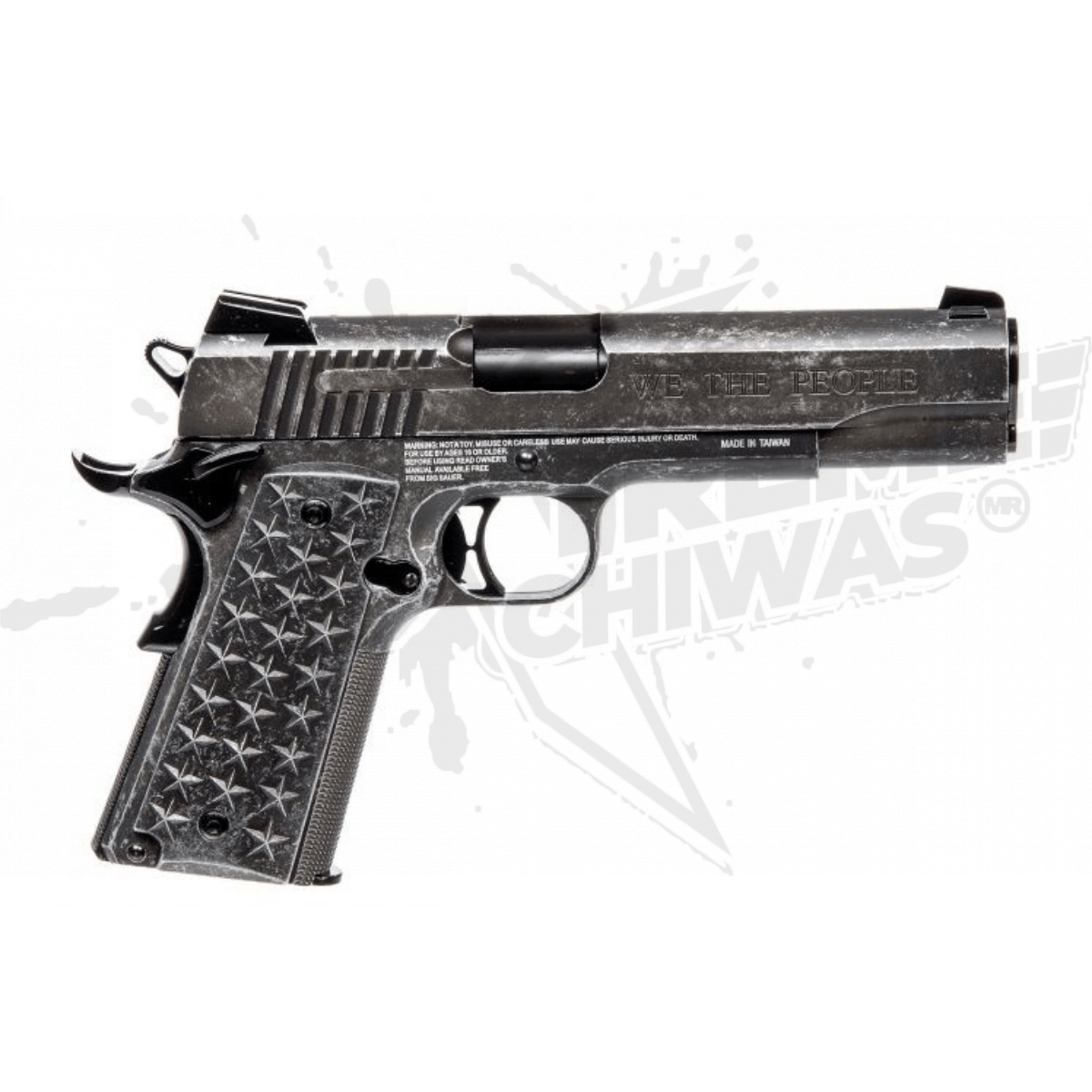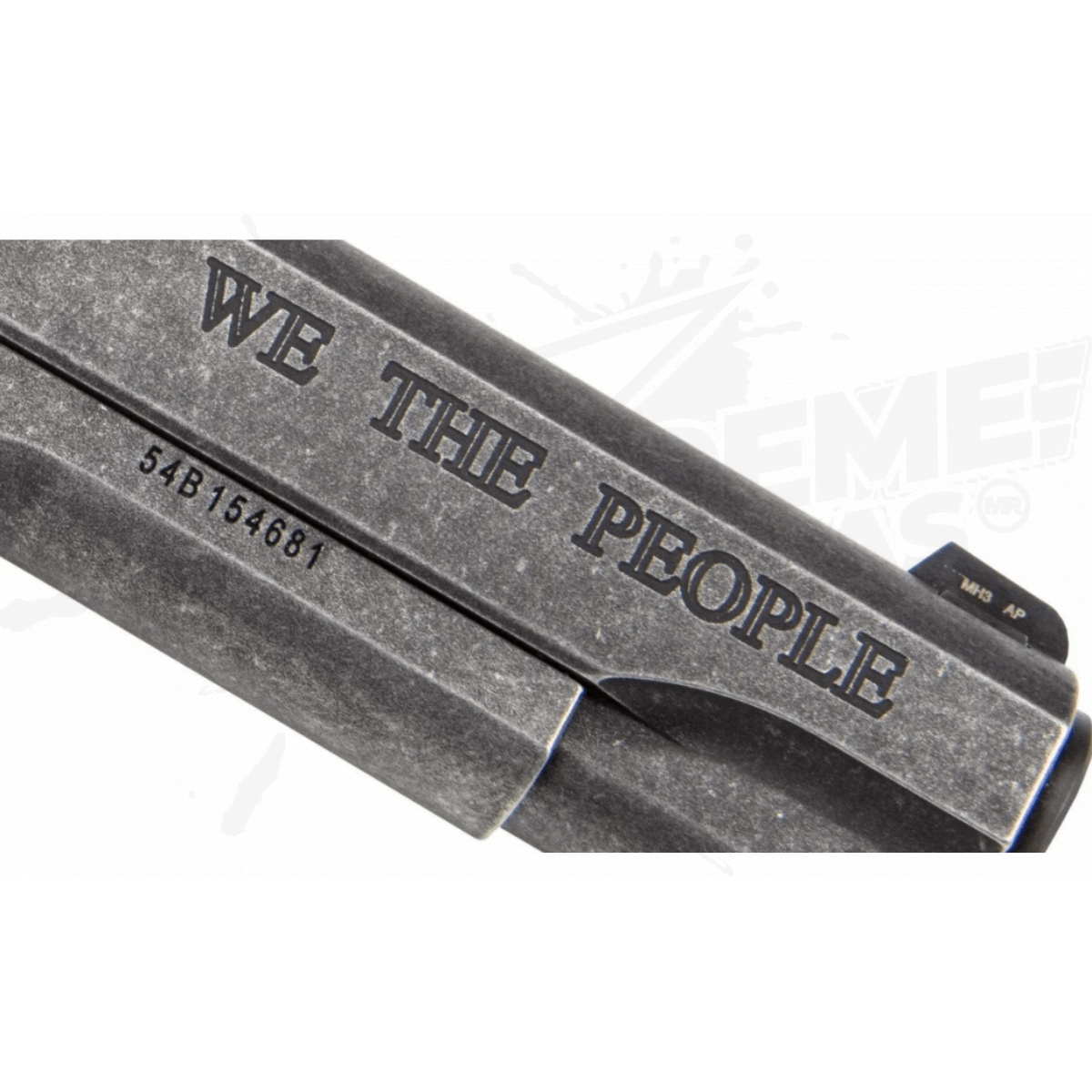 Inspirada en una rica historia patriótica, esta pistola sirve como un tributo adecuado tanto a la Segunda Enmienda como a la pistola más famosa de la historia. Esta pistola exclusivamente estadounidense presenta empuñaduras de aluminio personalizadas adornadas con 50 estrellas (25 por lado) que representan a cada estado en la unión. Un acabado desgastado en la diapositiva y el marco de acero inoxidable incluye grabados patrióticos, como 13 estrellas encima de la diapositiva y “WE THE PEOPLE” y “1776” en los planos de las diapositivas. Si bien honra el pasado, “We The People” está totalmente equipado para el uso moderno, con una seguridad ambidiestra y vistas nocturnas de bajo perfil.