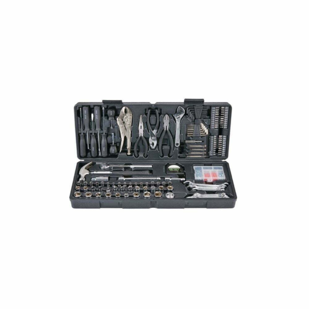 Trinquete de 1/4 pulg. Y 3/8 pulg. Y 42 enchufes, 6 destornilladores, 4 destornilladores de precisión, 1 destornillador de punta, 40 puntas, juego de llaves, 10 llaves combinadas, 1 llave ajustable, 16 llaves hexagonales, 4 alicates, martillo , cinta métrica y kit de hardware.