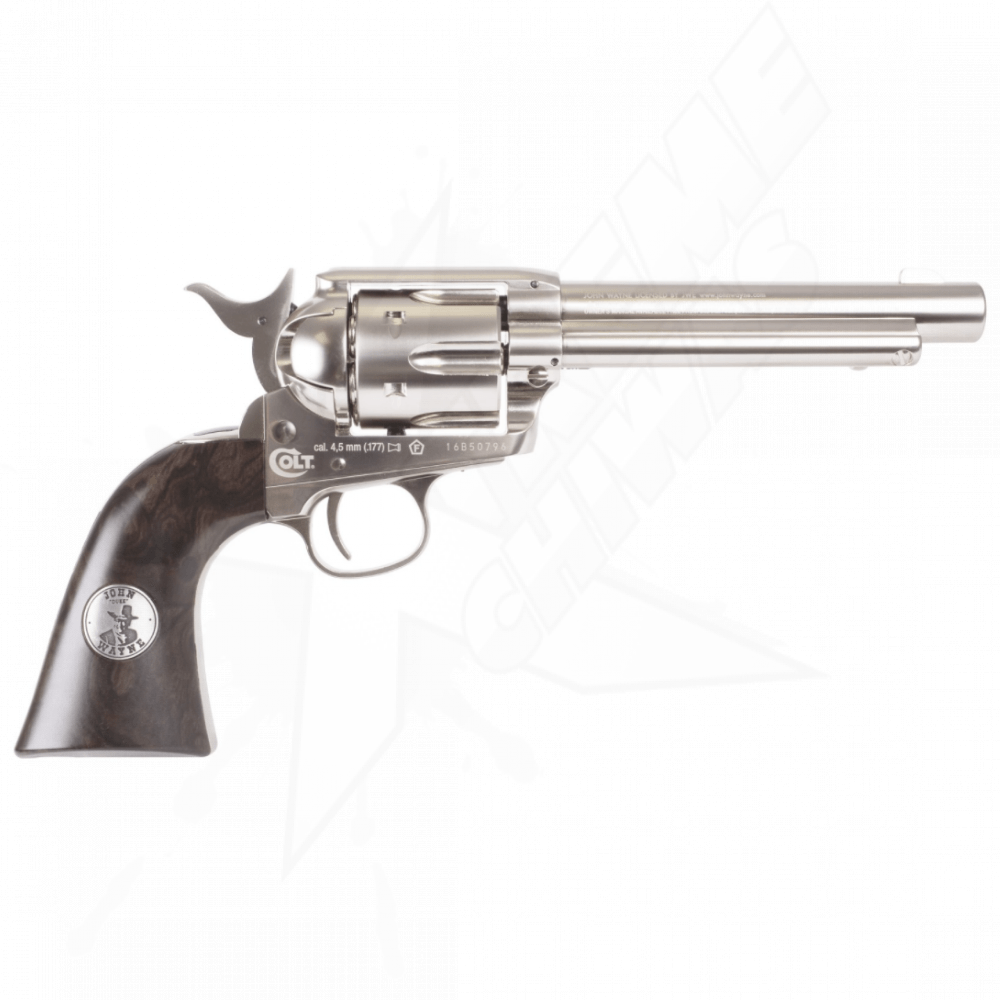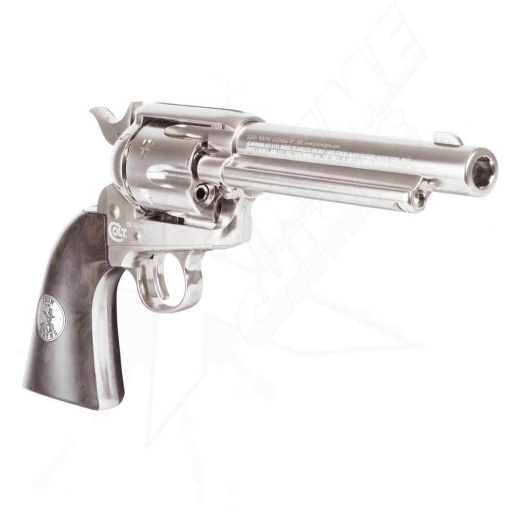 El revólver de CO2 dispara perdigones calibre .177, presenta acción auténtica. La firma de John Wayne está en la correa trasera de esta pistola de coleccionista, y puede elegir entre tres acabados atractivos y distintivos. El revólver de acción simple funciona con CO2, y el cilindro de 6 rondas tiene una varilla de expulsión que funciona para mayor realismo y conveniencia.