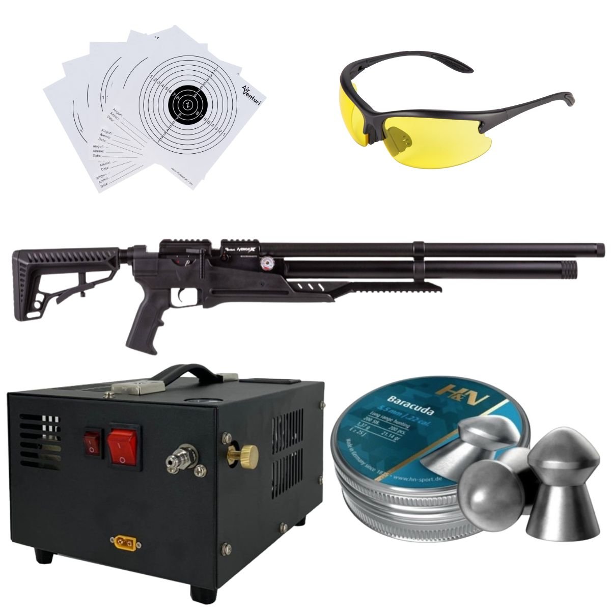 Rifle Air Venturi Avenge-X Tactical PCP .22 (5.5mm) TUBO 210cc Kit C/Compresor, pellets, lentes, targets.