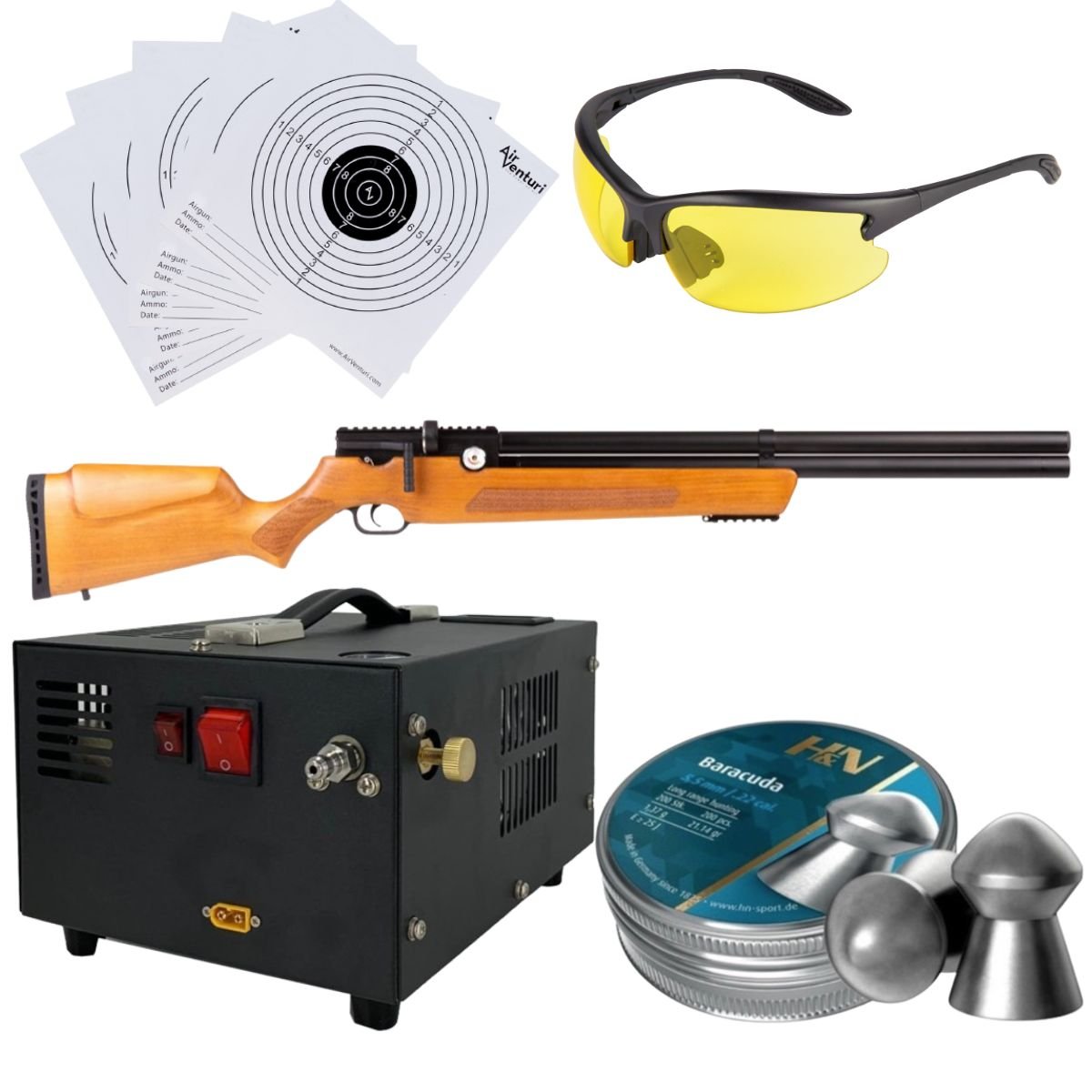 Rifle Air Venturi Avenger Madera Regulado PCP .22 Kit C/Compresor, Pellets, Lentes, Targets.