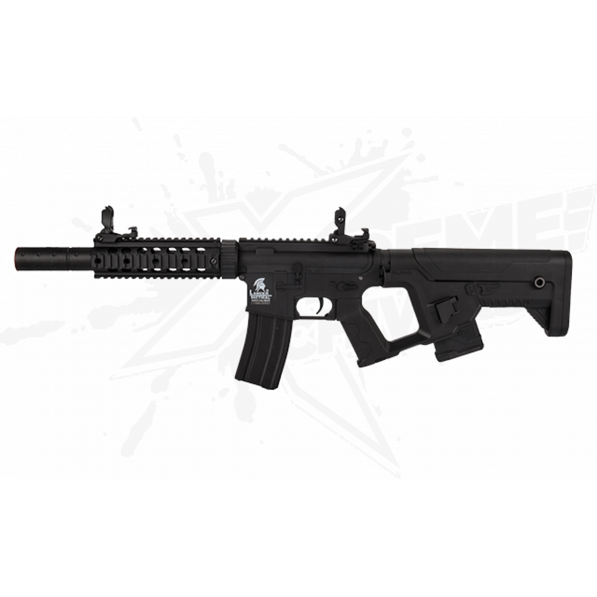 Construcción: caja de cambios de metal completo, cargador / receptores de polímero de nailon, empuñadura de pistola, rueda de enrollamiento, miras abatibles, culata Alpha