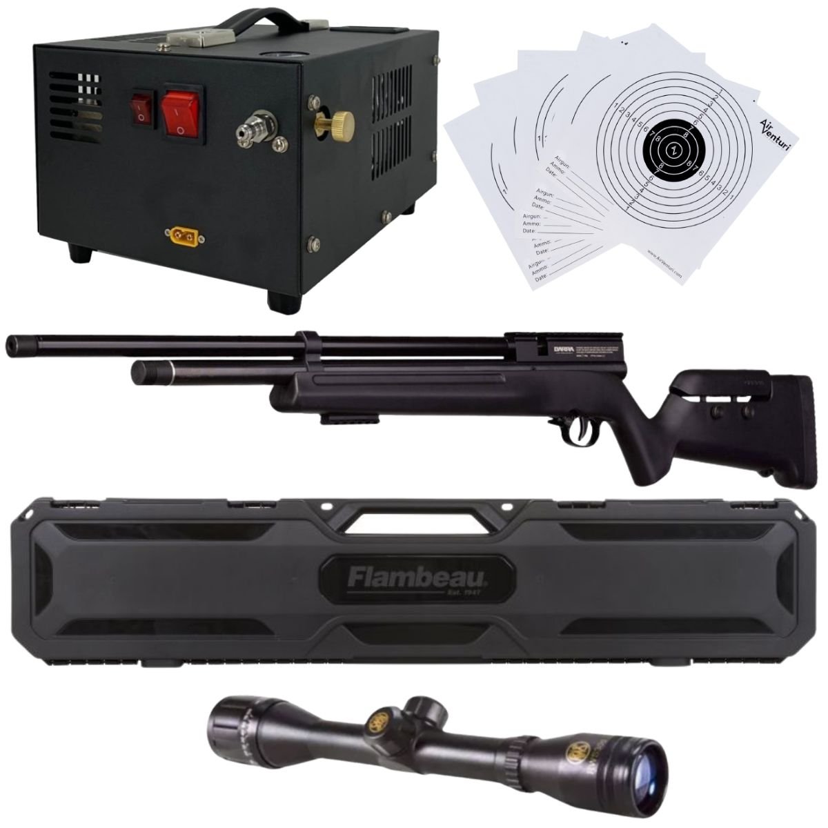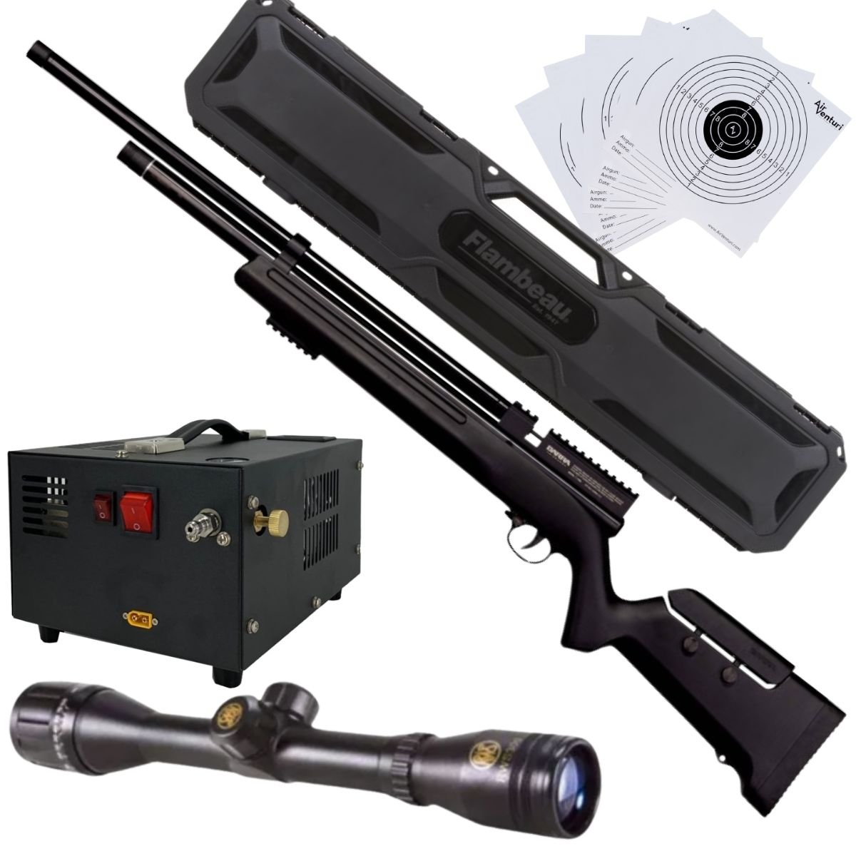Sé el primero en valorar “Rifle Barra Aire PCP .22 1100Z Compresor, Estuche, Mira, Targets”