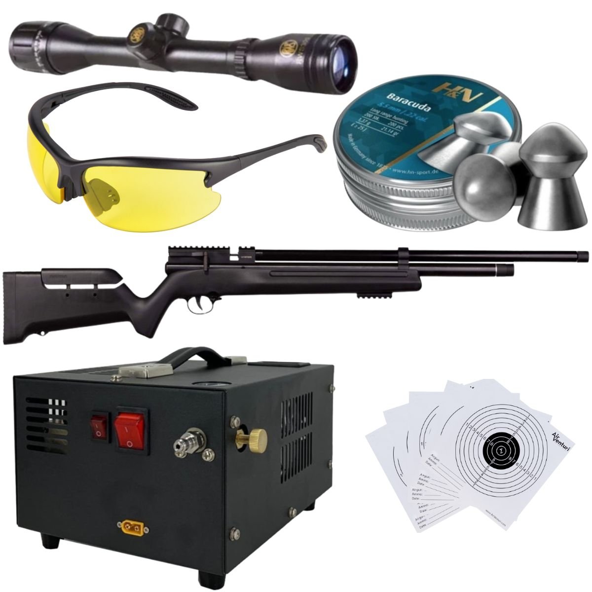 Rifle Barra Aire PCP .22 1100Z Compresor, Pellets, Mira, Lentes, Targets.