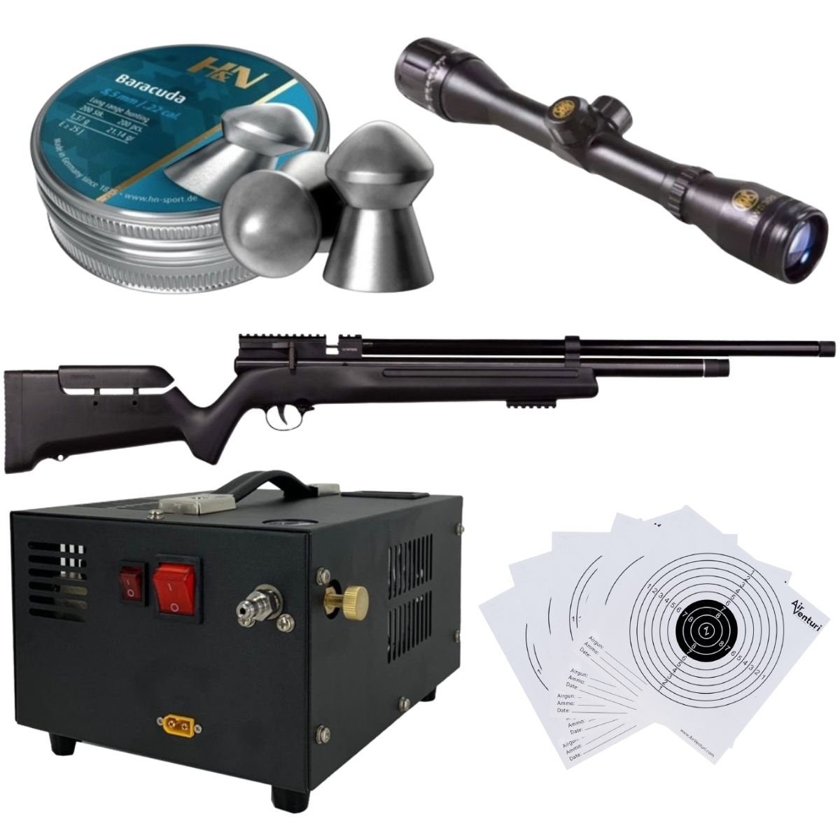 El cañón estriado tiene un extractor de aire de aluminio que se fija con roscas de ½-20, manteniéndolo perfectamente centrado en la carcasa. El obenque también tiene roscas de ½-20 bajo un protector de rosca estriado para una supresión de ruido adicional. La carcasa se bloquea en su lugar y se alinea con la acción con una banda de cañón que se atornilla a la culata en lugar de simplemente sujetarse alrededor del tubo de aire.
