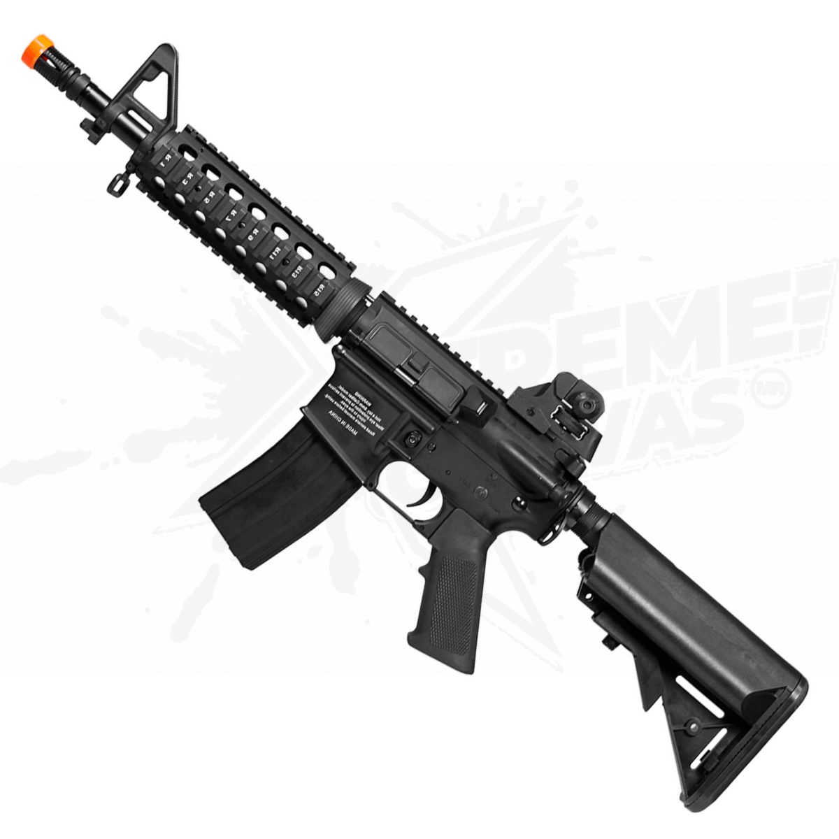 Este rifle Colt M4 semiautomático ofrece velocidades de disparo de alta potencia que lo colocan por delante de su competencia en el campo de batalla. La pistola es una réplica a escala 1: 1 de un M4 real y presenta marcas comerciales auténticas de Colt en el receptor. Esta pistola también cuenta con una culata ajustable de 4 posiciones, un cargador de 350 rd de alta capacidad y una velocidad de disparo de 390-400 fps (usando BB de .20g). Este rifle es ideal para escenarios de escaramuzas de airsoft cqb y tiene un riel cuádruple Weaver / Picatinny para montar linternas y visores opcionales de su elección. Una unidad de salto ajustable también le permite perfeccionar la precisión en todos sus tiros de larga distancia.