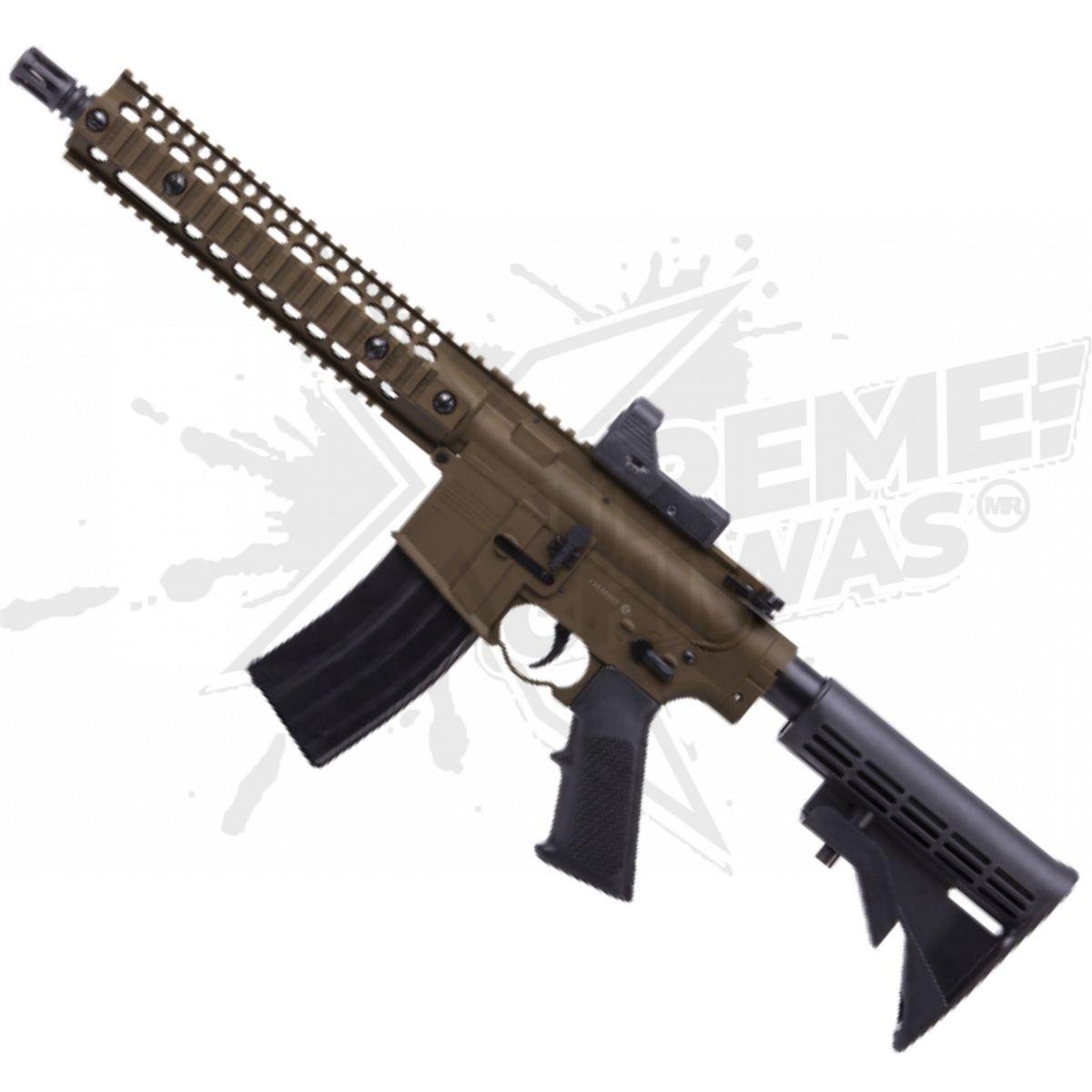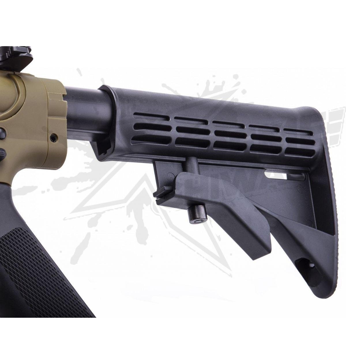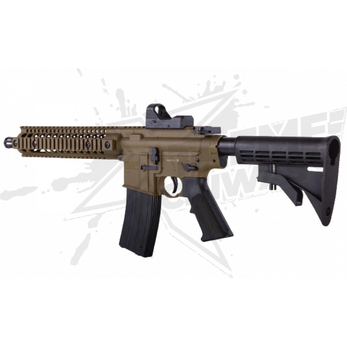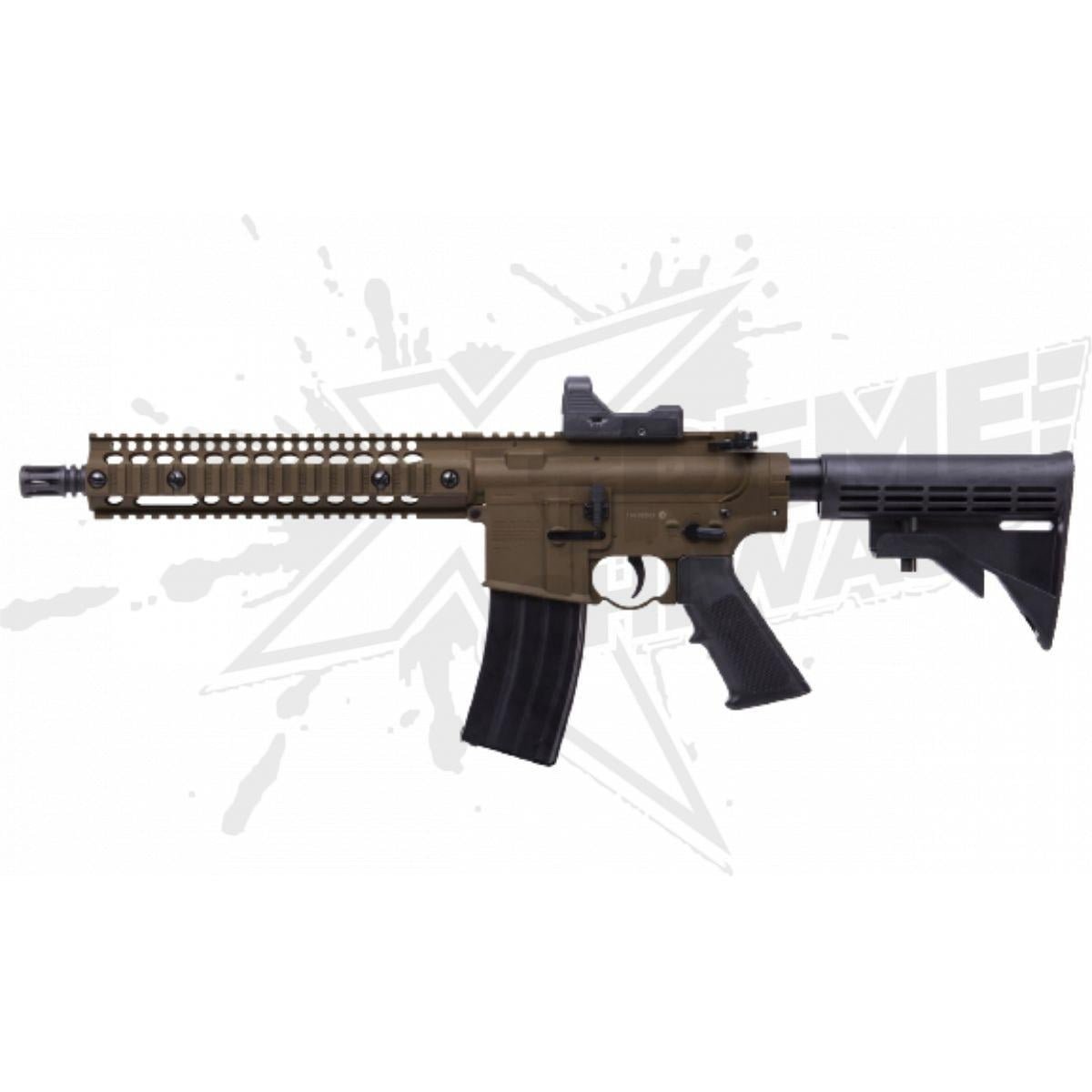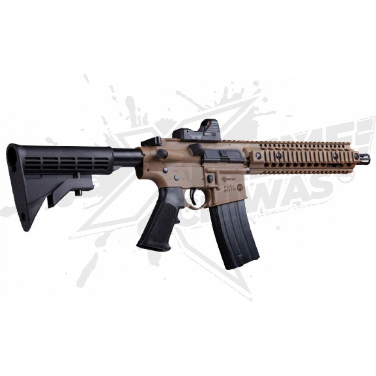 Alimentado por 2 cartuchos de CO2 en el cargador sin gotas número 25 y capaz de velocidades de hasta 430 fps y hasta 1400 disparos por minuto, este rifle está diseñado para divertirse en serio. La culata es ajustable en 6 posiciones diferentes para brindarle la longitud perfecta de tiro, y puede cambiar la empuñadura de pistola con su empuñadura compatible con AR favorita. Este rifle de aire es ideal para practicar y aprender a manejar un arma de manera segura, con su operación convincente, retroceso y función de cargador.