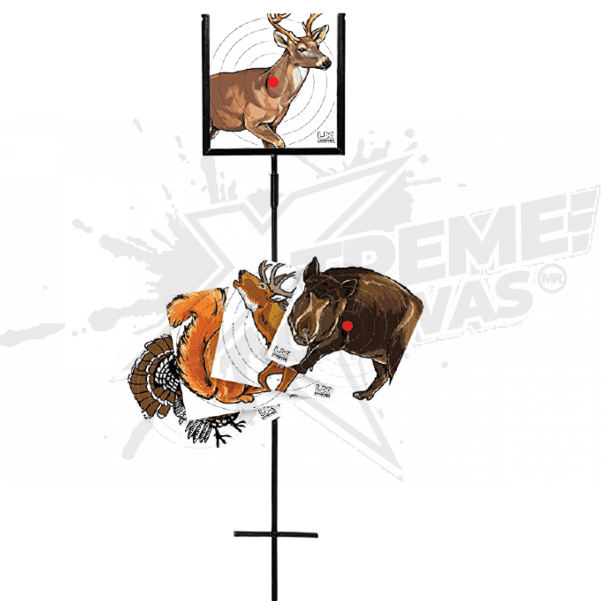 – TIRO AL BLANCO: Soporte de destino de papel, configuración de juego simple, 100 objetivos de papel incluidos 20 ciervos, 20 alces, 20 cerdos, 20 ardillas y 20 pavos, construcción de acero pesado, para usar con pistolas de aire comprimido .177 y .22.