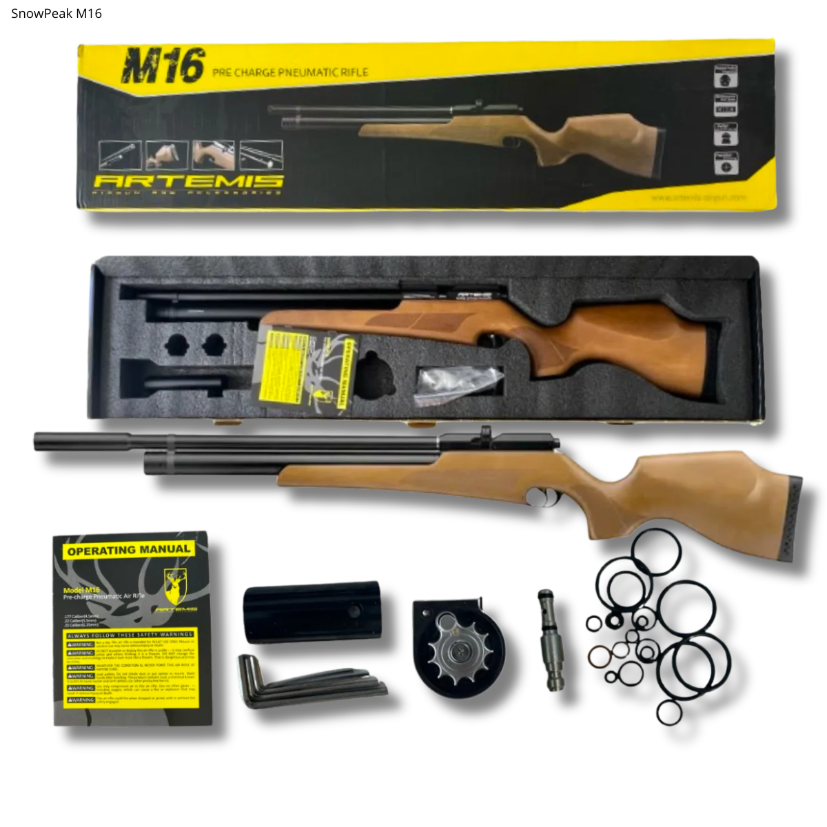El SnowPeak M16 es un rifle PCP compacto y refinado, diseñado para tiradores que valoran la precisión, eficiencia en el consumo de aire y un estilo tradicional. Equipado con una culata de madera de haya alemana, este modelo combina elegancia clásica con tecnología moderna, logrando un equilibrio perfecto entre rendimiento y diseño.