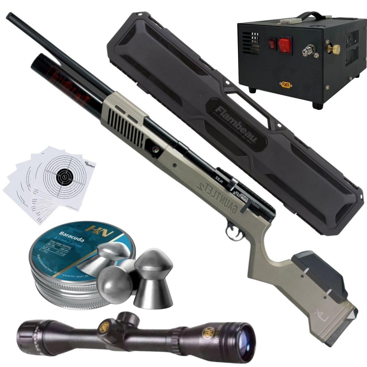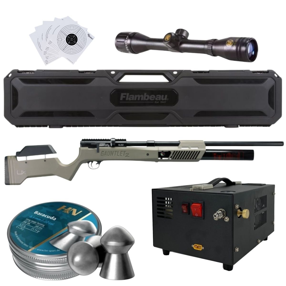 Sé el primero en valorar “Rifle PCP Umarex Gauntlet SL .22 c/compresor, pellets, estuche, mira, targets.”