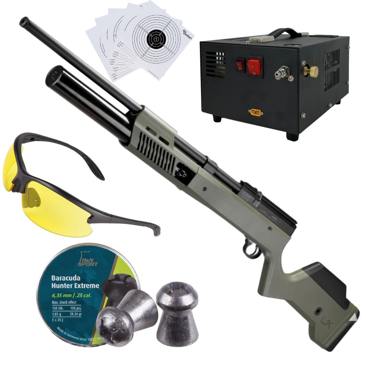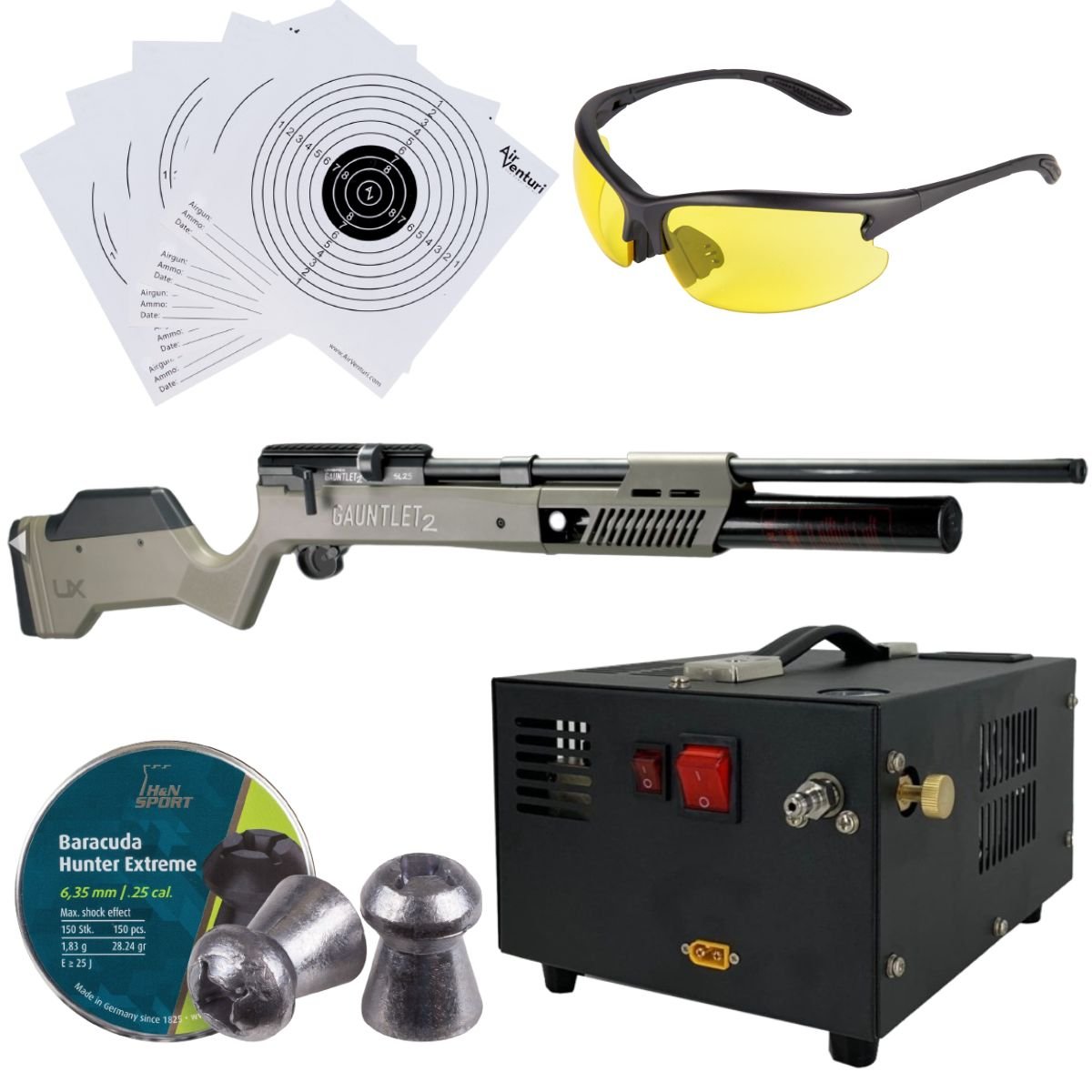 La increíblemente popular plataforma Gauntlet de Umarex evoluciona de nuevo, esta vez con la adición de una suave acción de palanca lateral. La Gauntlet 2 SL25 (calibre .25) sigue utilizando el mismo cargador Gauntlet rotativo de 8 disparos con indexación automática con el que ya estará familiarizado y la misma culata ergonómica de color FDE para todo tipo de climas que se estrenó con la Gauntlet 2. Coloque la óptica de precisión de su elección en la combinación de cola de milano/carril para visor Picatinny y comience a disparar su perdigón favorito del calibre .25 o un proyectil de pistola de aire comprimido a los objetivos a distancia. El Gauntlet 2 SL25 produce 55 libras pie de energía (FPE) y enviará un perdigón de 25 granos por la boca del cañón a 1.000 FPS. Si es nuevo en el mundo de los rifles PCP, necesitará una fuente de aire de alta presión, es decir, un compresor de aire que pueda comprimir el aire hasta 4.500 psi, como el Umarex ReadyAir. Una opción es un tanque externo de fibra de carbono que puede llenar en una tienda de paintball, algunas tiendas de buceo y algunos campos/tiendas de airsoft. Una bomba manual de alta presión también es una opción para aquellos que estén en buena forma física.