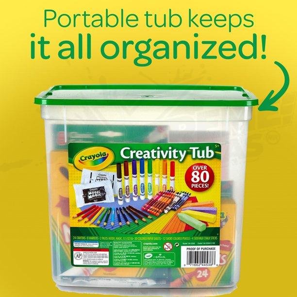 Un juego de arte Crayola Creativity Tub con 80 piezas de materiales para manualidades, desde marcadores y papel para manualidades, para modelar magia y tiza para aceras.